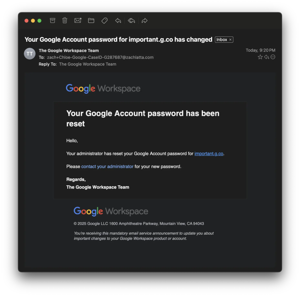 To make her story more believable, she followed up with an email sent from an official-looking domain: important.g.co.