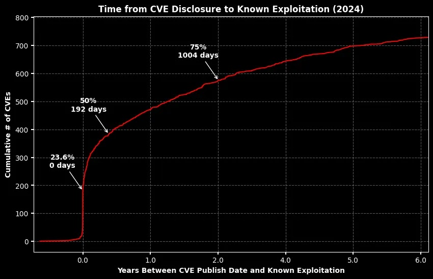 An alarming trend observed in 2024 is the speed at which vulnerabilities are being exploited. VulnCheck reports that 23.6% of Known Exploited Vulnerabilities (KEVs) were actively exploited on or before their public disclosure date.